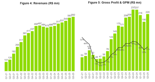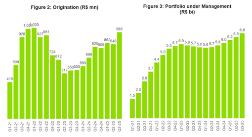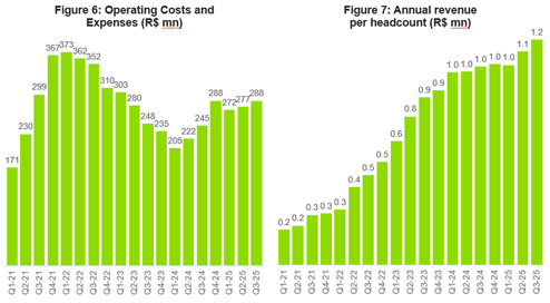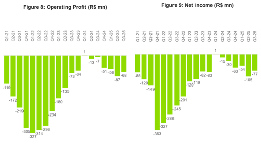 In Q3-25, we recorded an operating loss of R$68.2million (see Figure 8) and a net loss of R$77.1 million (see Figure 9). Importantly, we maintained a neutral cash flow position, which enables us to fund our growth internally without the need for external capital, a key pillar of our long-term strategy. The performance of this quarter highlights our continued momentum and underscores the strength of our discipline in portfolio expansion, cost control and focus on sustainable, long-term value creation.